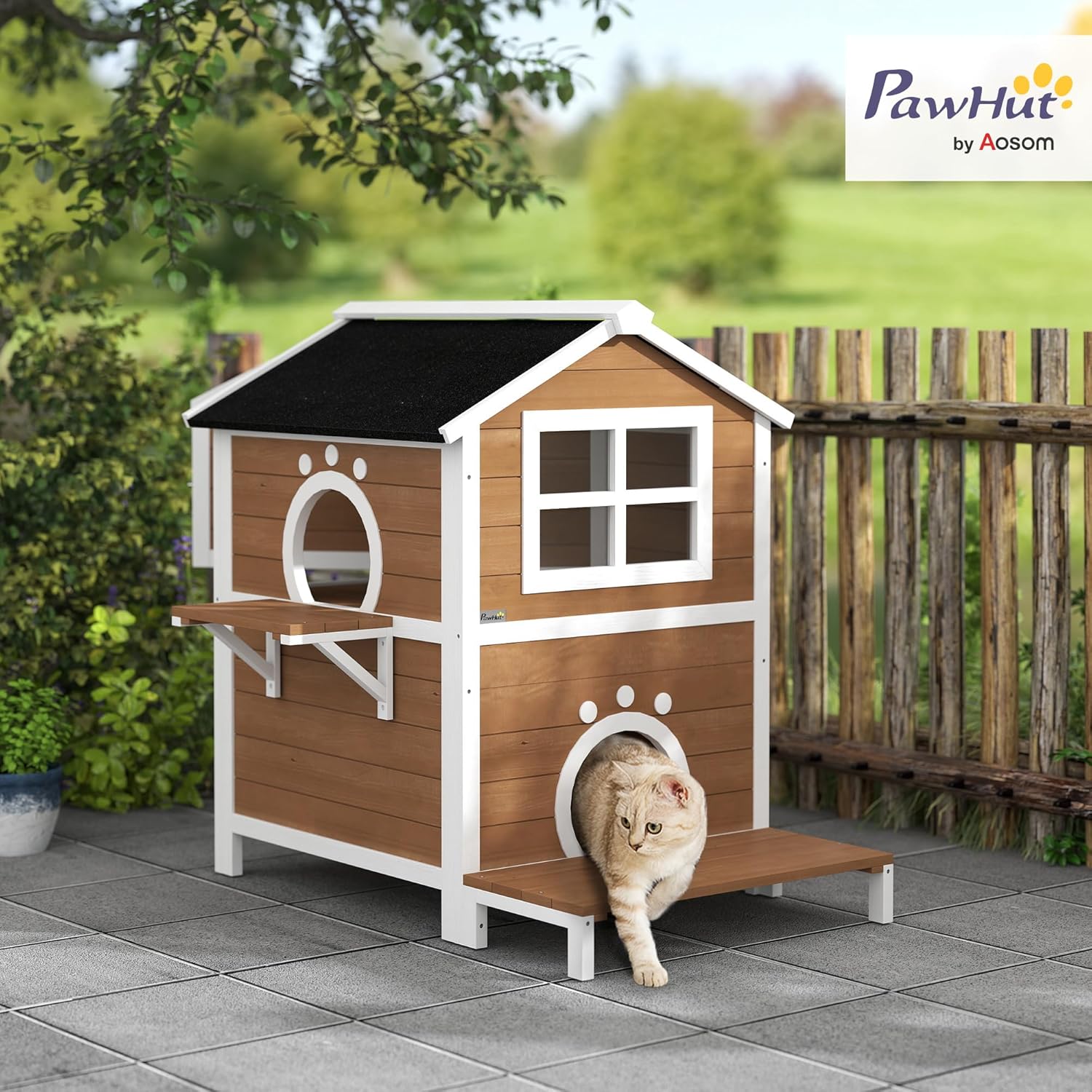 PawHut Wooden Cat House with Window, Balcony, Weatherproof Cat House with 2 Levels, Removable Base, for 1-2 Cats, Indoor, Outdoor, 66 x 66 x 90 cm, Brown